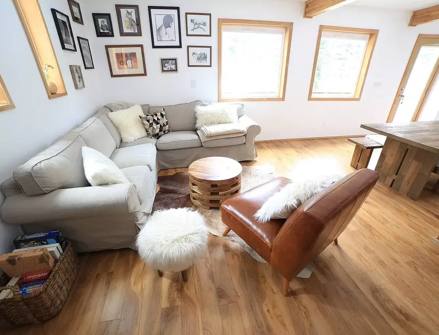 ● The living room has a full-size, pull-out sleeper sofa